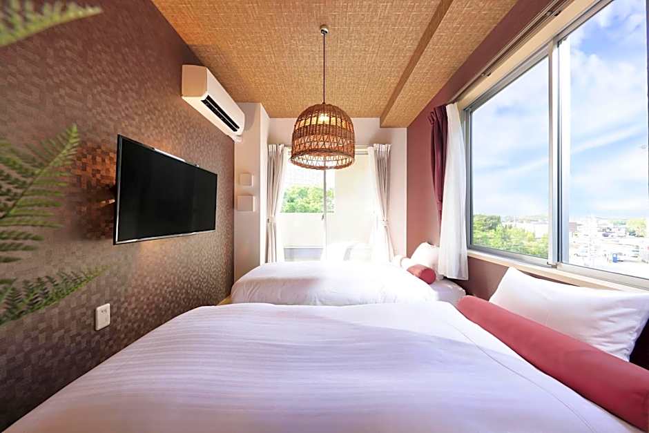 The quadruple room provides air conditioning, tatami, as well as a shared bathroom featuring a bidet and a hairdryer. The quadruple room features a wardrobe, an electric kettle, yukata, heating and a flat-screen TV. The unit offers 4 futons.